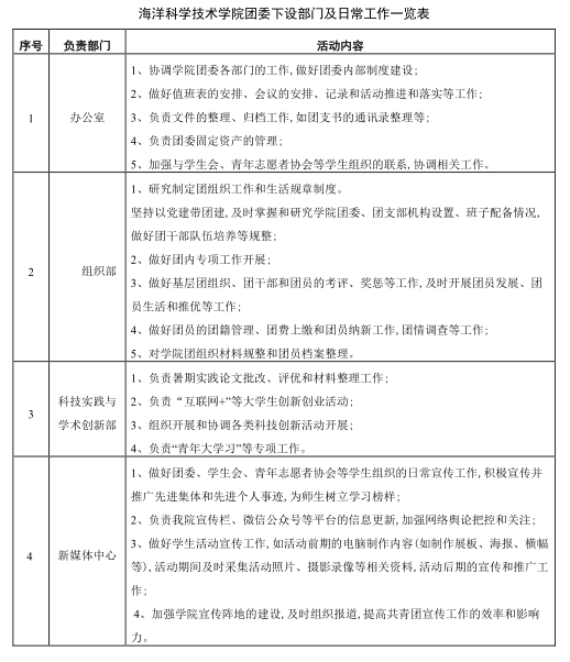 目前,根据本院自身特点及需要,我院团委下设4个部门,分别是办公室、组织部、科技实践和学术创新部和新媒体中心。
