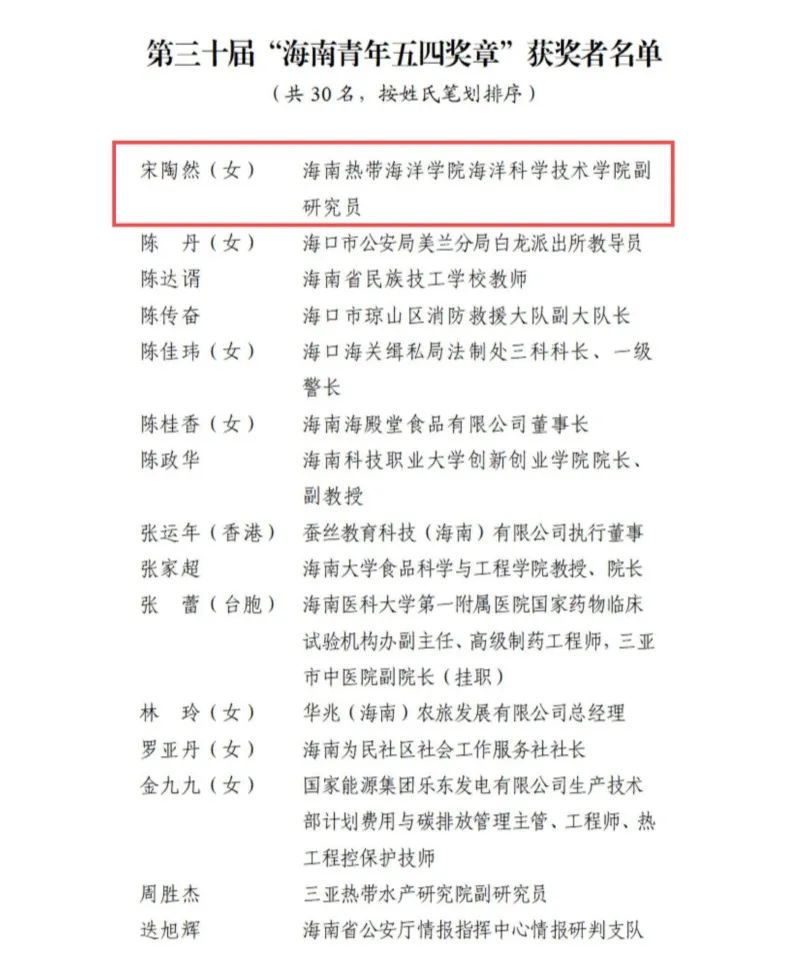 此次荣获海南青年五四奖章,既是对宋陶然个人的表彰,也是对她所代表的青年科研工作者的鼓舞和激励。